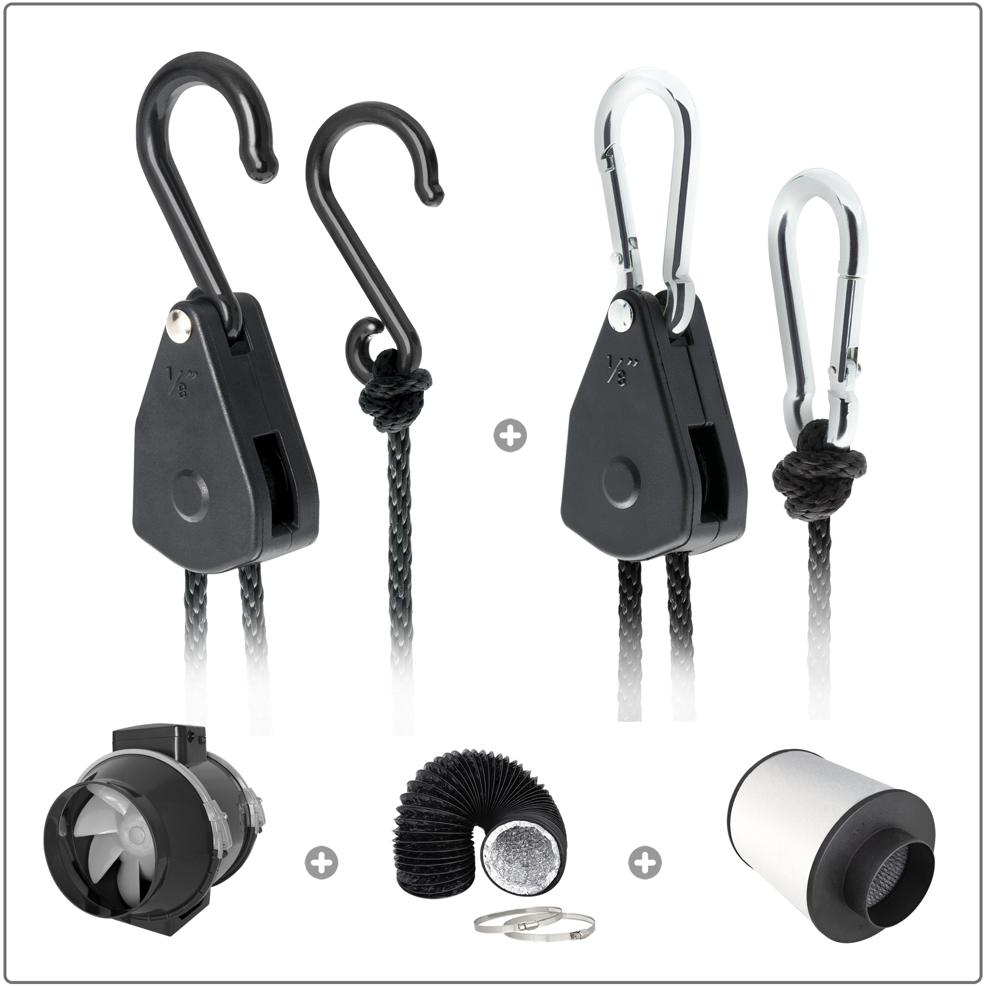 - Lighthanger Ermöglicht das Aufhängen und Ausrichten des Filters im gewünschten Abstand direkt an seinen Enden an der Struktur des Grow-Zeltes. Es besteht aus 2 Seilen (1,5 m lang), 2 Sicherheitsrollen und 4 Haken (18 mm Durchmesser). Fassungsvermögen bis zu 5 kg. 100% Prime PP-Kunststoff.